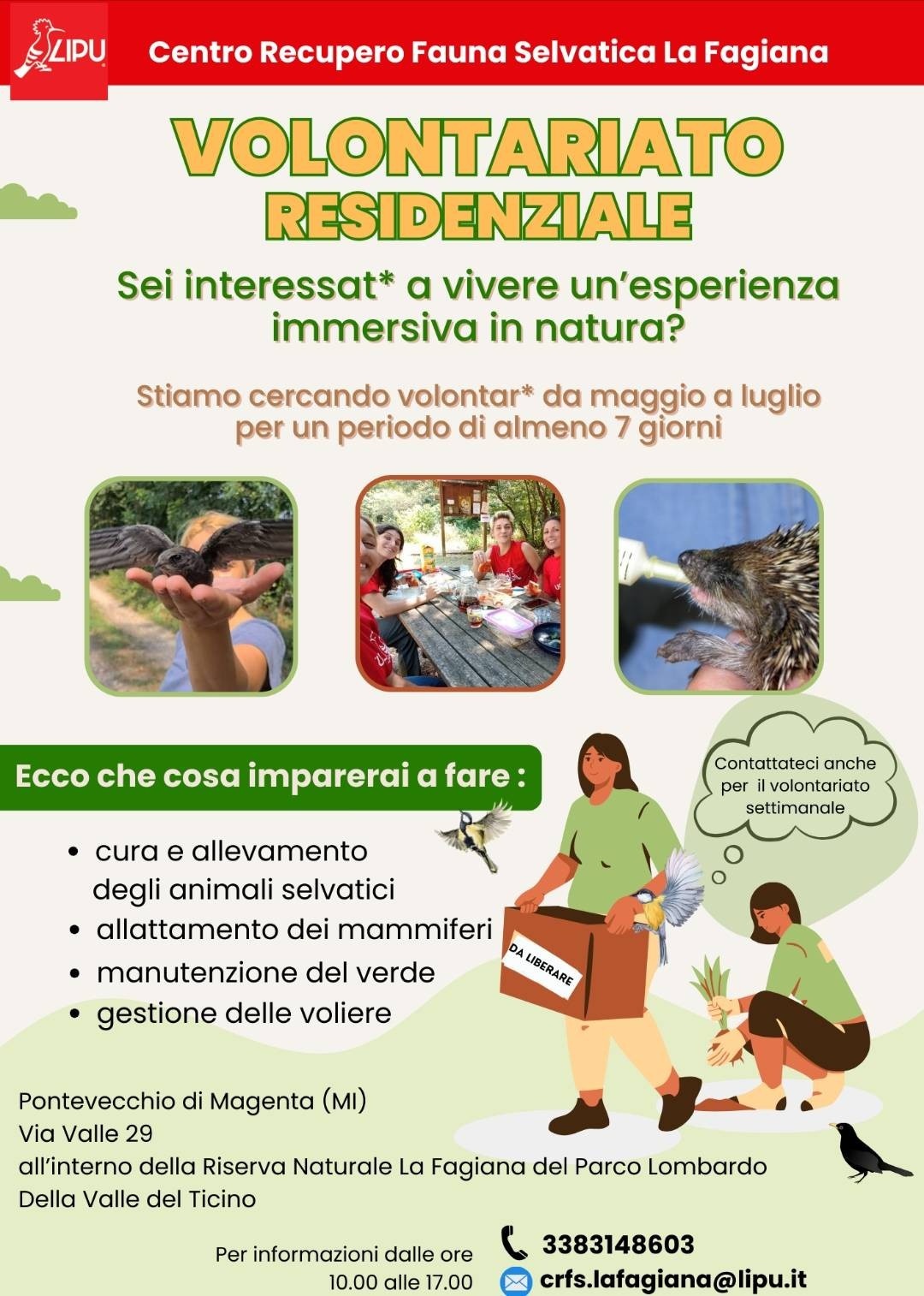 📌📣🔍🌞🦅🐦 Il Centro di Recupero Fauna Selvatica CRFS LIPU La Fagiana di Pontevecchio di Magenta (MI) ci avvisa che è in cerca di volontari per la stagione estiva: sarà possibile vivere un'esperienza immersiva in natura, all'interno della Riserva Naturale della Fagiana, imparando a prendersi cura degli animali selvatici presenti - volatili e mammiferi   ➡️ LINK QUI